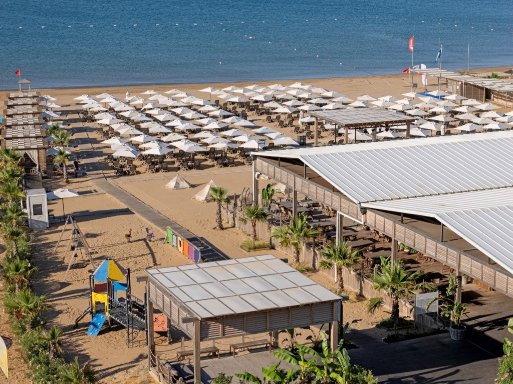 Собствен, пясъчен с дължина 450 м. Чадъри, шезлонги, матраци и плажни кърпи на плажа и при басейна - безплатно.