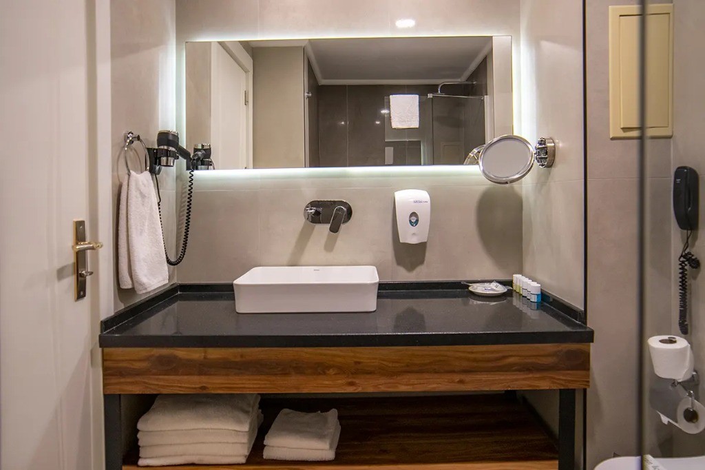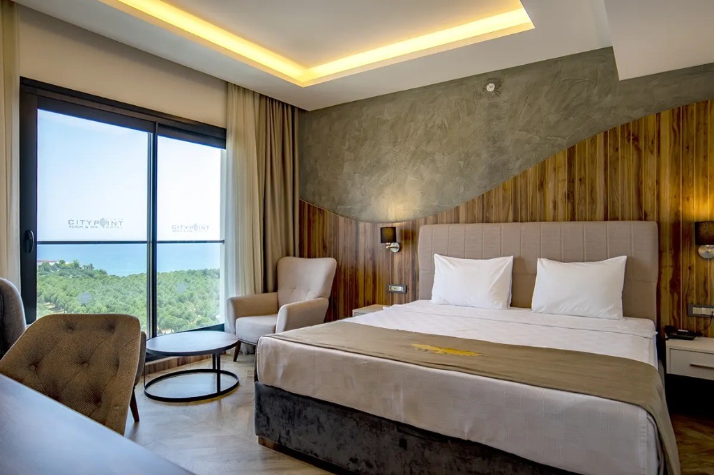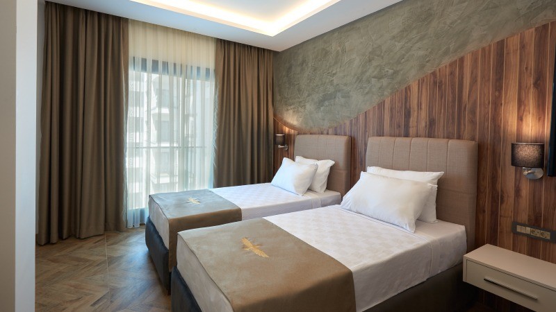 Хотелът разполага с 192 стаи. от които 45 стандартни с изглед градина, 4 стандартни без балкон, 68 стандартни с изглед море, 5 стандартни с изглед море без балкон, 26 фамилни с изглед градина с балкон, 2 фамилни с изглед градина без балкон, 236 фамилни с изглед море с балкон, 7 фамилни с изглед море без балкон, 10 делукс с изглед море, 2 стаи за инвалиди. Всички стаи са оборудвани с климатик, телевизор, телефон, баня с душ/ вана, сешоар, мини бар/платен/, сет за чай/кафе, сейф (безплатен). Почистване на стаите – всеки ден, смяна на спалното бельо и хавлиите – 2 пъти в седмицата.