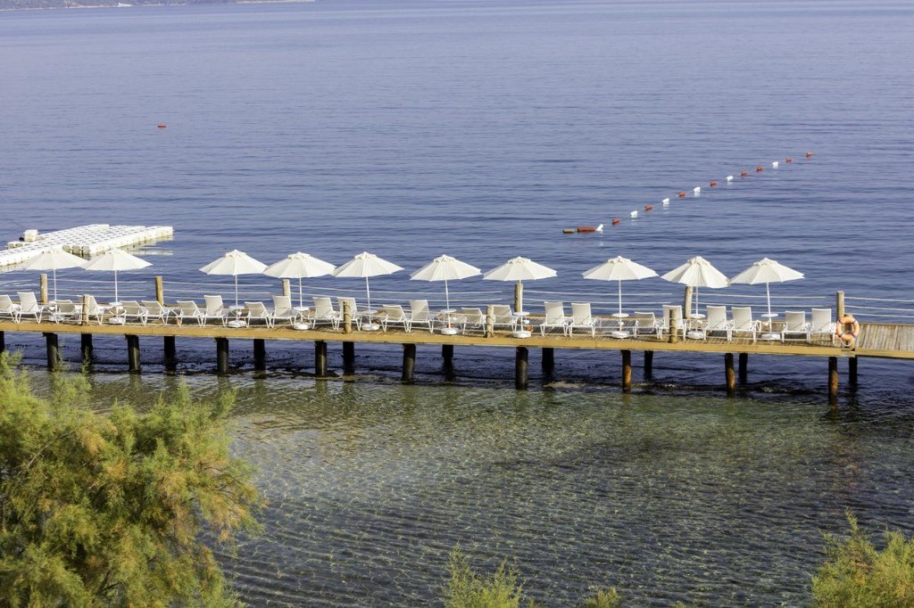 Собствен плаж 700 м с платформа. При басейна и на плажа: чадъри, шезлонги, кърпи и матраци - безплатно.