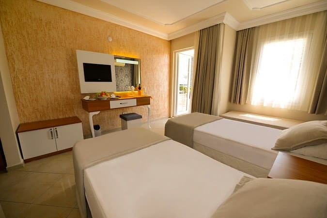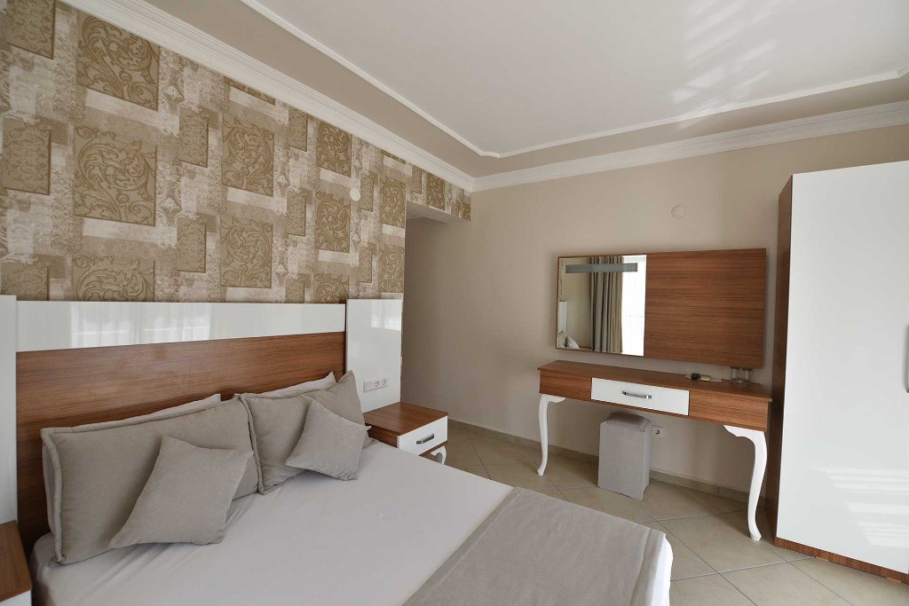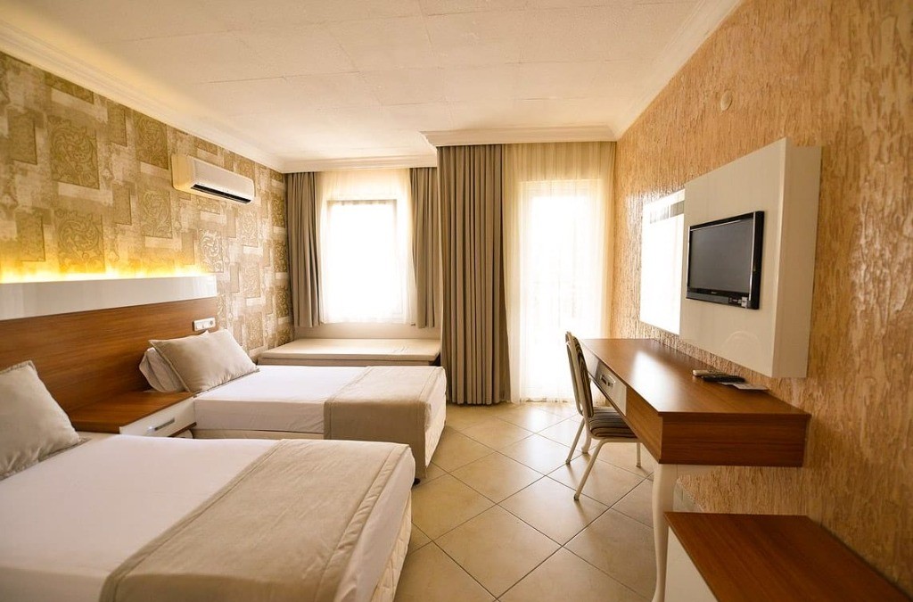 Хотелът се състои от 7 блока на по 3 етажа и разполага с общо 132 помщения за настаняване - стандартни стаи (с гледка море или градина) и фамилни стаи. Всички те са оборудвани с климатик, телевизор със SAT-TV и музикален канал, телефон, мини бар, сейф, баня с душ кабина, сешоар, балкон. Почистване на стаите - всеки ден, смяна на бельото - два пъти в седмицата.