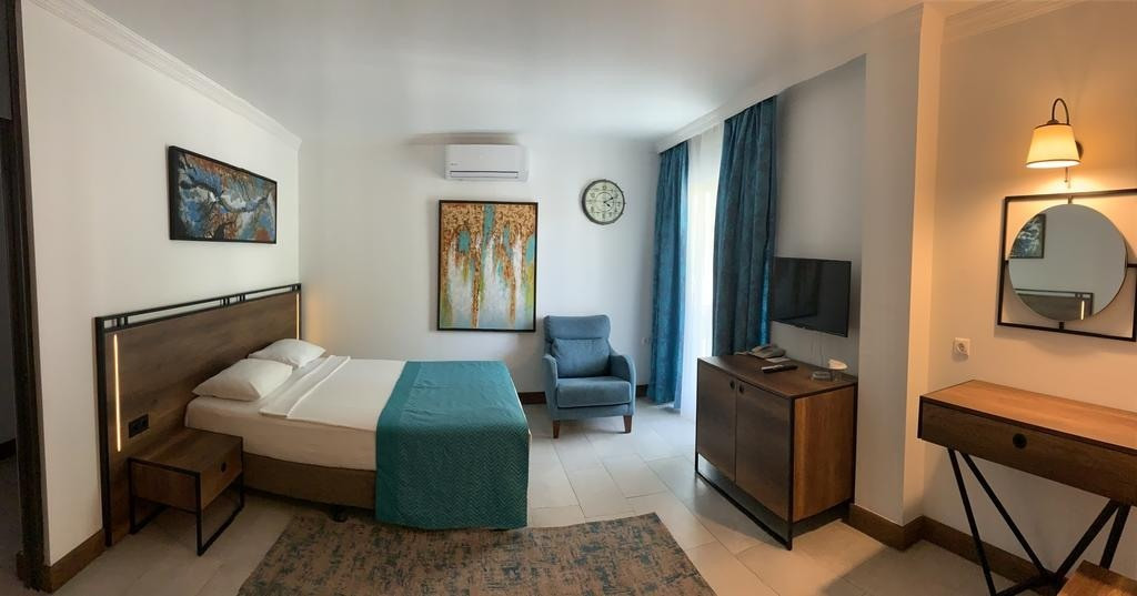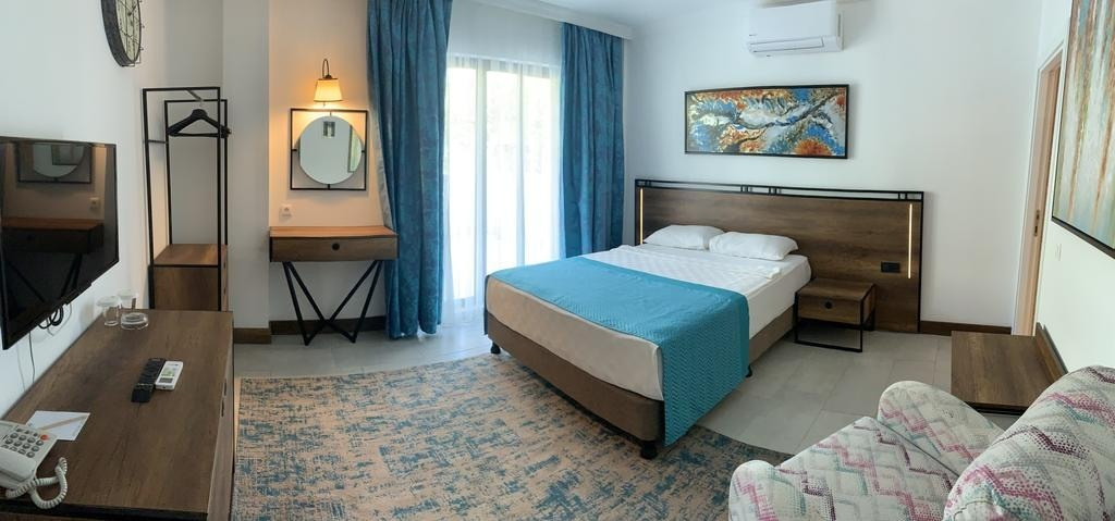 Разполага с общо 45 стаи в двуетажни къщички - 22-25 кв.м. В стаите са на разположение: баня с душ, сешоар, балкон или тераса, телевизор със сателитна телевизия, климатик, телефон. Почистване на стаите - всеки ден, смяна на къпри и спално бельо - през 3 дни.