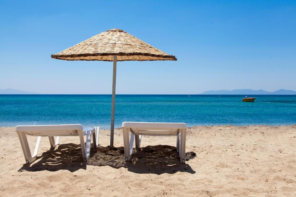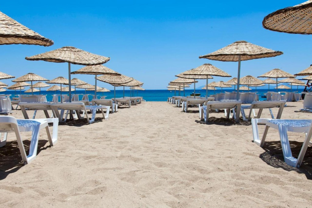Собствен, пясъчен. Чадъри и шезлонги при басейна и на плажа - безплатно.