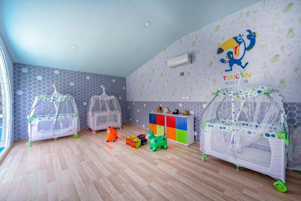 За децата: Детски открит басейн, мини клуб (4-12), детска площадка, детска дискотека, детско столче, бебешка кошара.