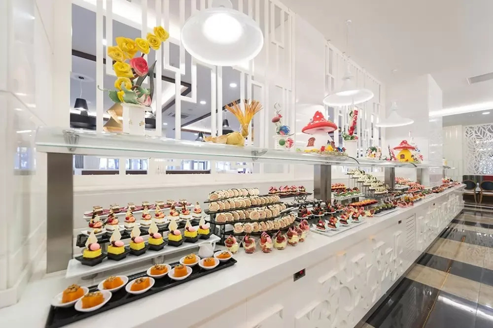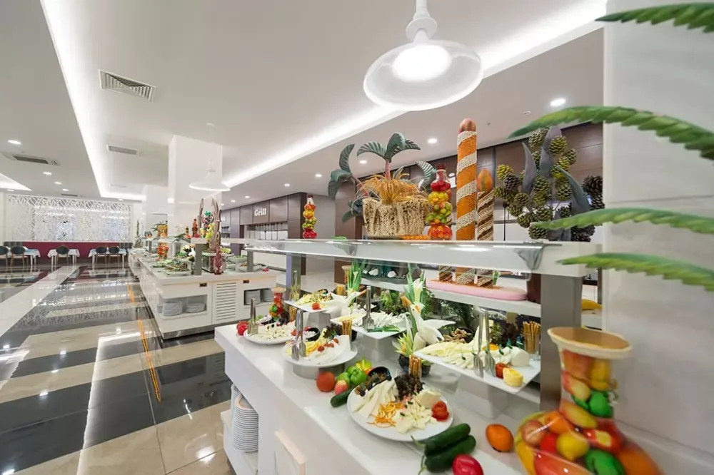 Основен ресторант, 2 а - ла - карт ресторанта, 2 снек бара, 7 бара, бистро, сладкарница, 2 открити и 1 закрит басейн, водни пързалки, дискотека, амфитеатър, нощен клуб, магазини, конферентни зали. За децата: Открит и закрит басейн, водни пързалки, анимация, мини клуб (4-12), мини диско. Безплатни услуги: Сауна, турска баня, парна баня, фитнес (16+), аеробика, дартс, боча, водна гимнастика, тенис на маса, плажен волейбол, анимация, WiFi(в лоби). Платени услуги: Масаж, фризьор, лекар, химическо чистене, билярд, електронни игри, рент-а-кар, водни спортове.