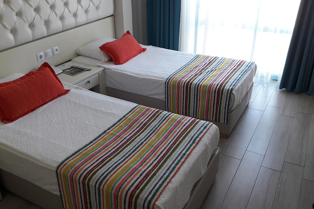Хотелът разполага общо с 123 стаи, разположени в 6-етажна сграда. - стандартни стаи с изглед суша (20м²), разполагат с френски тип прозорец / без балкон / Стандартни стаи с изглед море (24м²) с балкон, фамилни стаи с изглед море (40м²). Всички стаи са оборудвани с климатик, телевизор, телефон, баня с душ, сешоар, мини бар (безплатен, зареден само с вода), сейф (платен). Почистване на стаите - всеки ден, смяна на спалното бельо и кърпите - 3 пъти в седмицата.