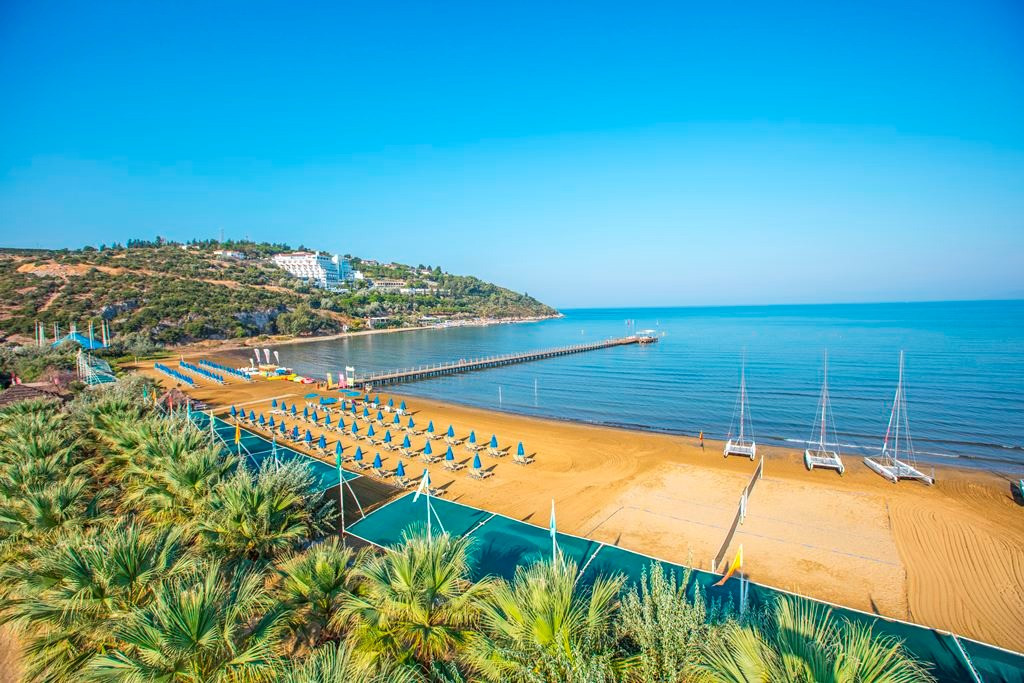 Собствен, пясъчен с дължина 300м и кей и 150 м дължина. Чадъри, шезлонги и матраци на плажа и при басейните – безплатно, плажни кърпи – срещу депозит.