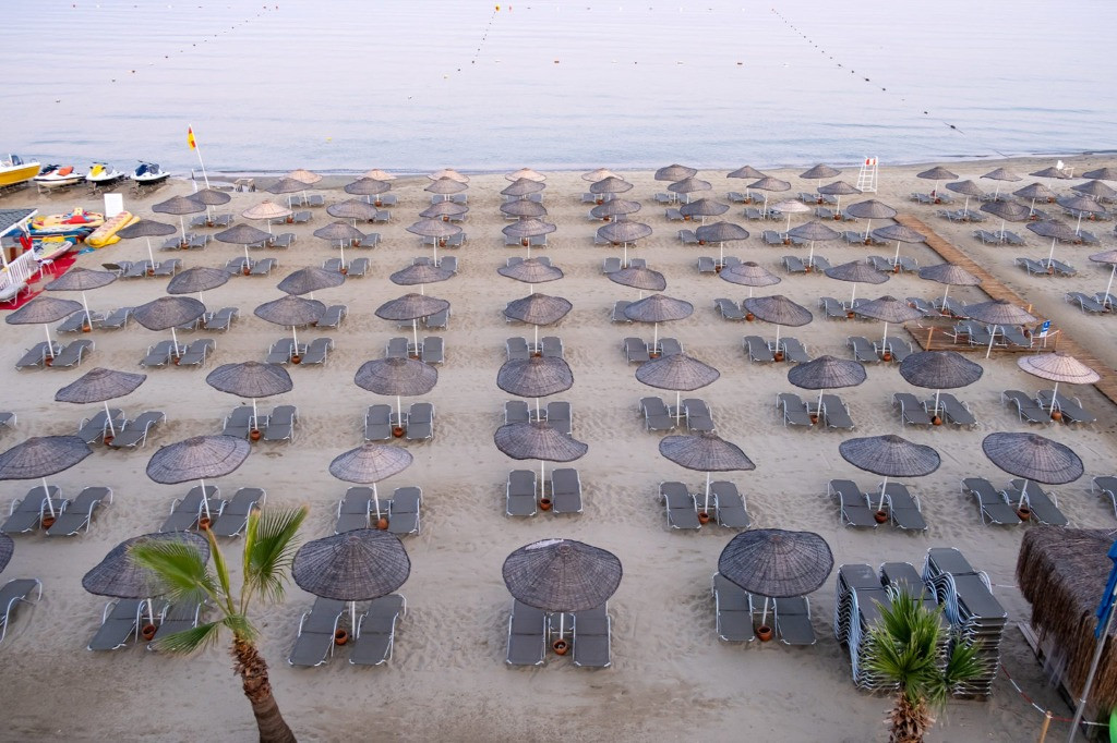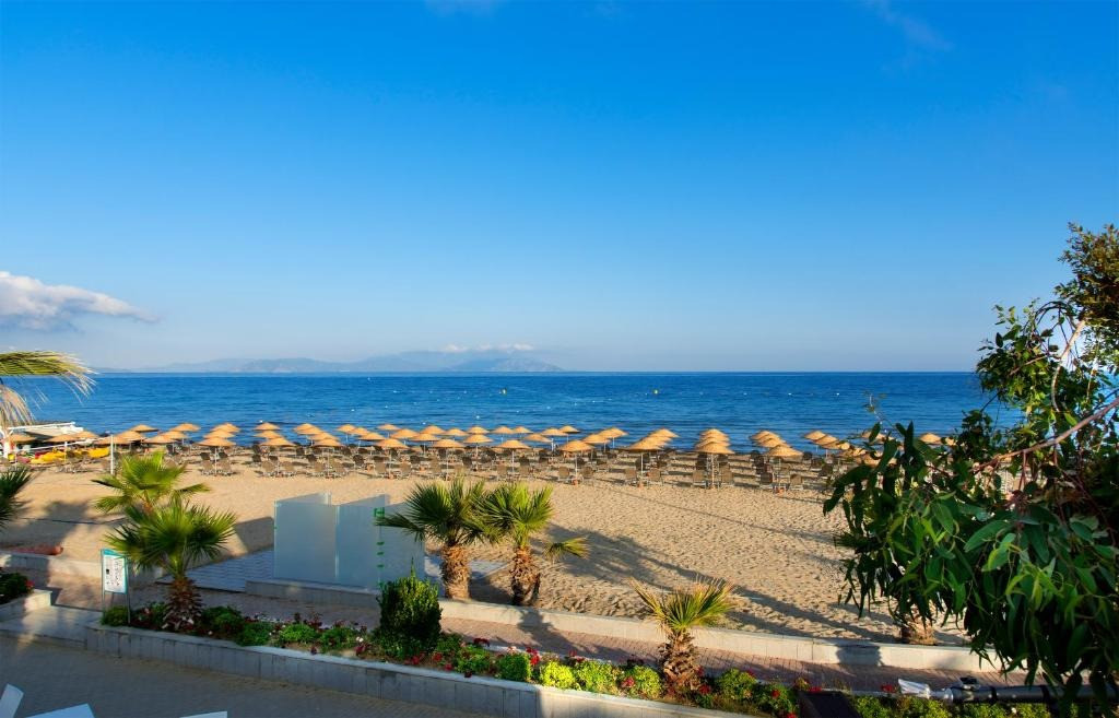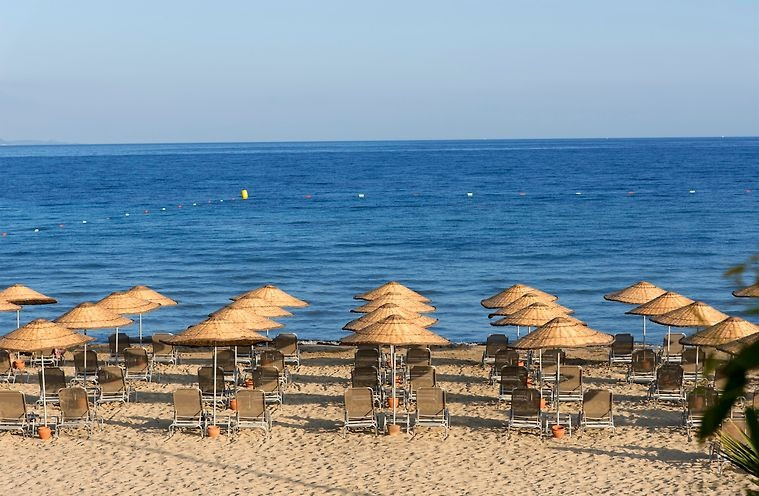 Собствен, пясъчен удостоен със сертификат "Син флаг". Чадъри, шезлонги и плажни кърпи при басейна и на плажа - безплатно.