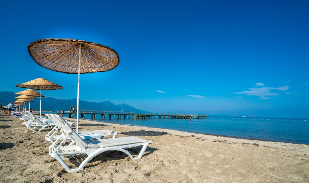 Собствен - пясъчен, част от плаж Лонг бийч. Чадъри и шезлонги на плажа и при басейна – безплатно, плажни кърпи – срещу депозит.
