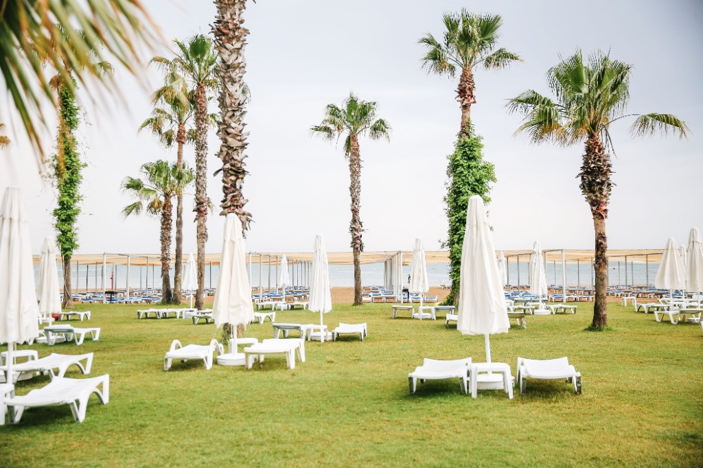 Собствен пясъчно-чакълест плаж. Шезлонги, чадържи, матраци на плажа и при басейна - безплатно.