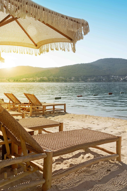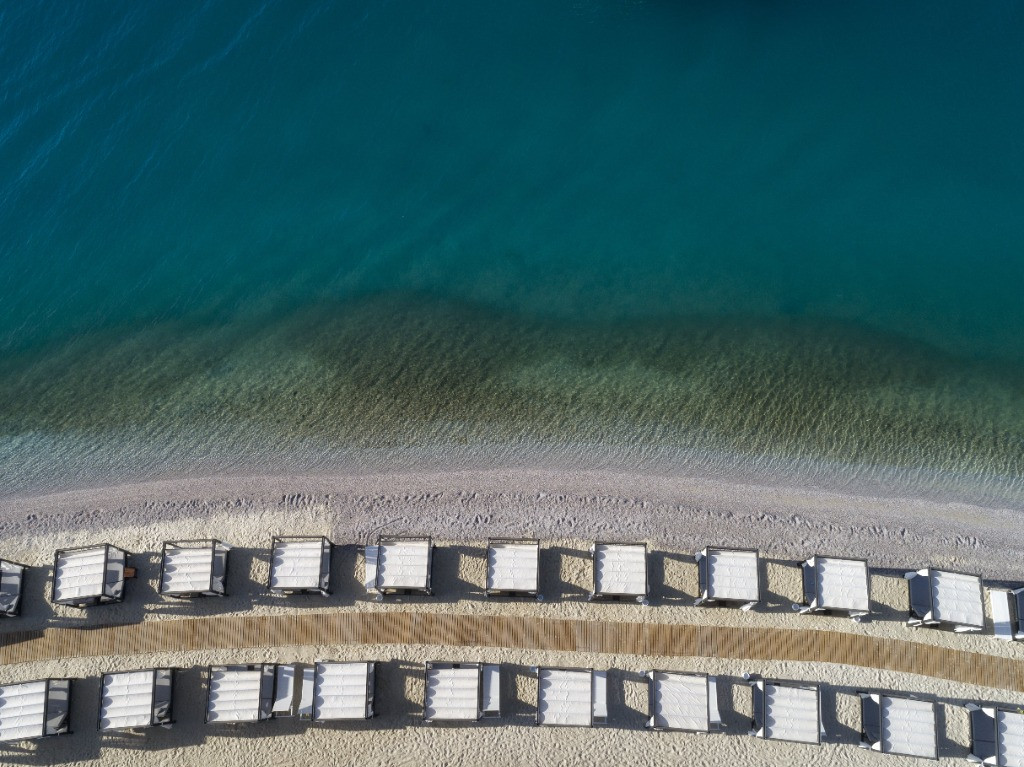 Собствен пясъчен плаж с бял пясък и дължина от 350 метра, притежател на "Син флаг" - чадъри и шезлонги на плажа и при басейна безплатно, плажни кърпи - безплатно.